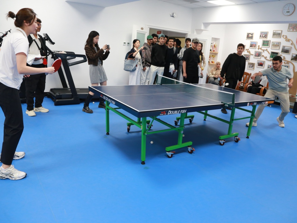 代表团中的女同学们则来到了乒乓球教室。北京交通大学体育部张华庆老师先为大家系统讲授了握拍姿势,并为大家轮流喂球,让每位同学在实践中体验正确的接球和发力方式。在代表团同学的积极要求下,老师安排大家进行双打和单打比赛,激烈的对战让大家真正体验到了乒乓球运动的魅力。讲解部分结束后,男同学们也来到了乒乓球教室,他们表达了对乒乓球运动的浓厚兴趣。几位有过专业运动基础的同学们主动向教练发起友谊赛邀约,中阿友谊在乒乓球的一声声清脆碰撞中得到了升华。