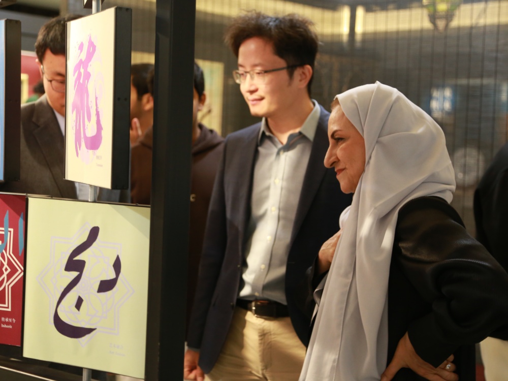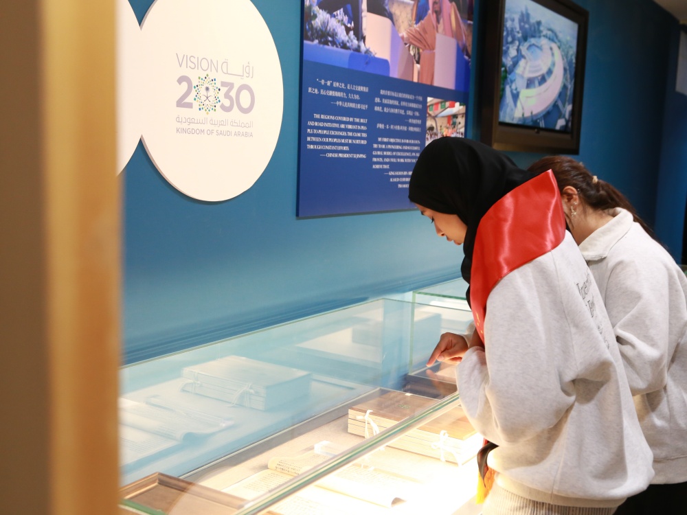 行程尾声,代表团与阿拉伯语系师生来到了阿卜杜勒·阿齐兹国王公共图书馆北京大学分馆,代表团师生应邀前往分馆地下一层的“东方智慧书法展”进行参观,在中阿书法文化的碰撞中感受中国书法的内在生命力,体悟东方智慧。展览现场,代表团同学们执笔挥毫,体验中国传统书法艺术,在空白的宣纸上留下中文和阿拉伯语的文化印记。还有代表团同学在VR虚拟环境中收获了独特的书法体验,沉浸式感受数字技术中的书法艺术创新表达。在中国国际电视台CGTN的采访中,阿联酋学生哈姆丹表达了自己对中文和中华文化的高度热忱。