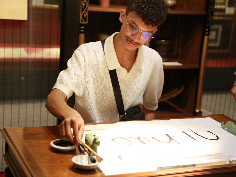 代表团学生执笔挥毫、阿联酋学生哈姆丹接受采访