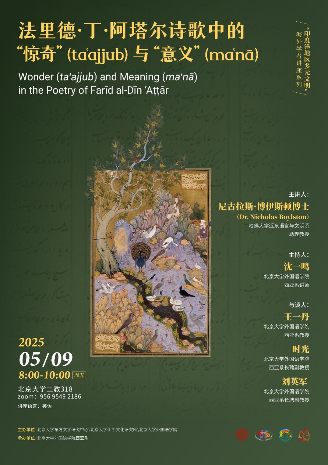 2025年5月9日上午,哈佛大学近东语言与文明系助理教授尼古拉斯·博伊斯顿博士(Dr. Nicholas Boylston)在线上为北京大学师生做了主题为“法里德·丁·阿塔尔诗歌中的‘惊奇’(ta‘ajjub)与‘意义’(ma‘nā)”的讲座。本次讲座是“印度洋地区多元文明”海外学者讲座系列之一,由北京大学东方文学研究中心、北京大学伊朗文化研究所和开云电子登录主办,开云电子登录西亚系承办。讲座由开云电子登录西亚系讲师沈一鸣主持,西亚系教授王一丹、长聘副教授时光、长聘副教授刘英军与谈。到场的还有波斯语专业本科生,以及来自北京大学中文系、历史学系和经济学院等院系的师生。