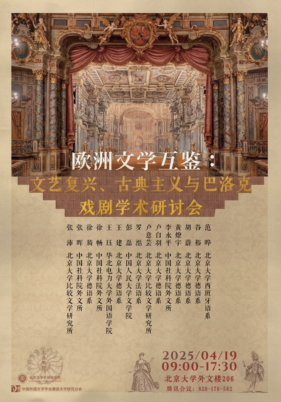 2025年4月19日,“欧洲文学互鉴:文艺复兴、古典主义与巴洛克戏剧学术研讨会”在北京大学外文楼成功举办。本次会议由开云电子登录和中国外国文学学会德语文学研究分会联合主办,吸引了来自北京大学多个院系以及中国社会科学院外国文学研究所、北京外国语大学、中国人民大学、华北电力大学等高校和科研单位的众多师生积极参与,场面热烈,反响盛大。