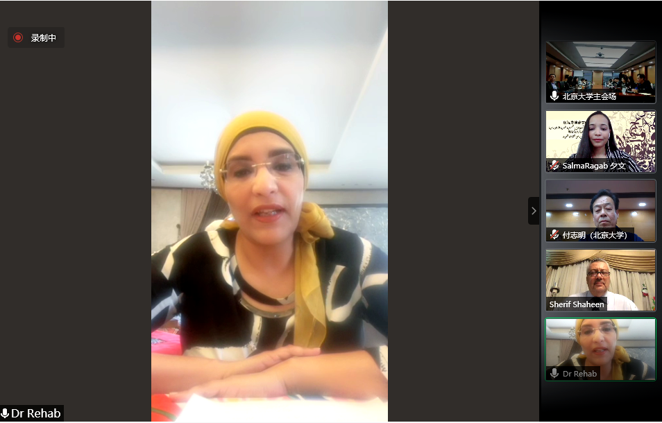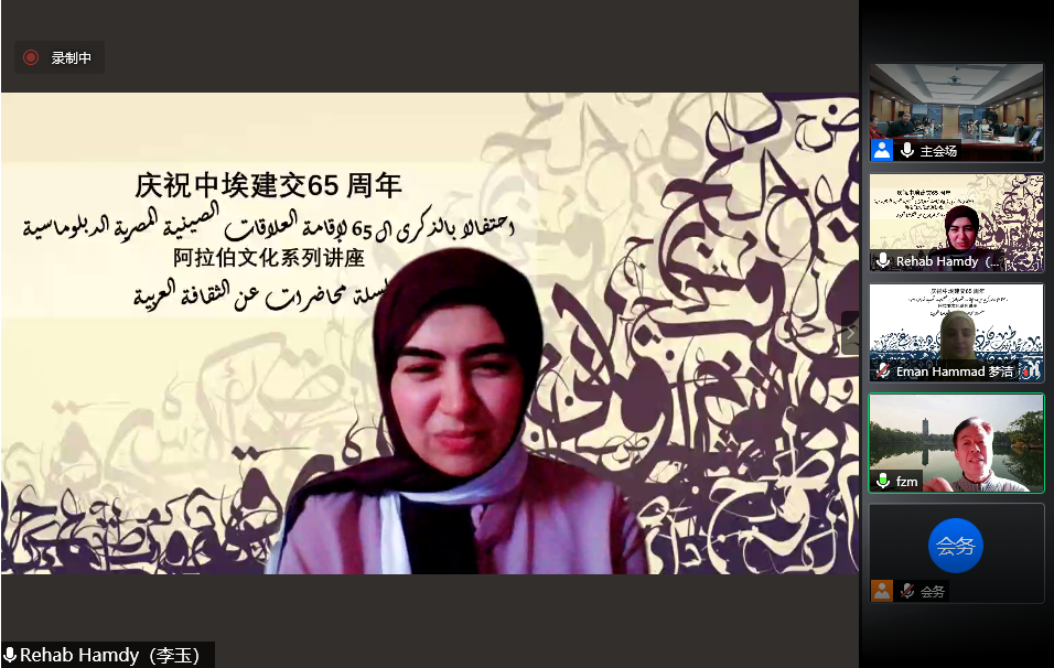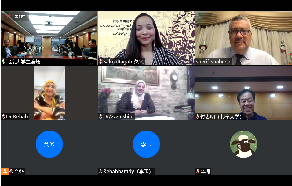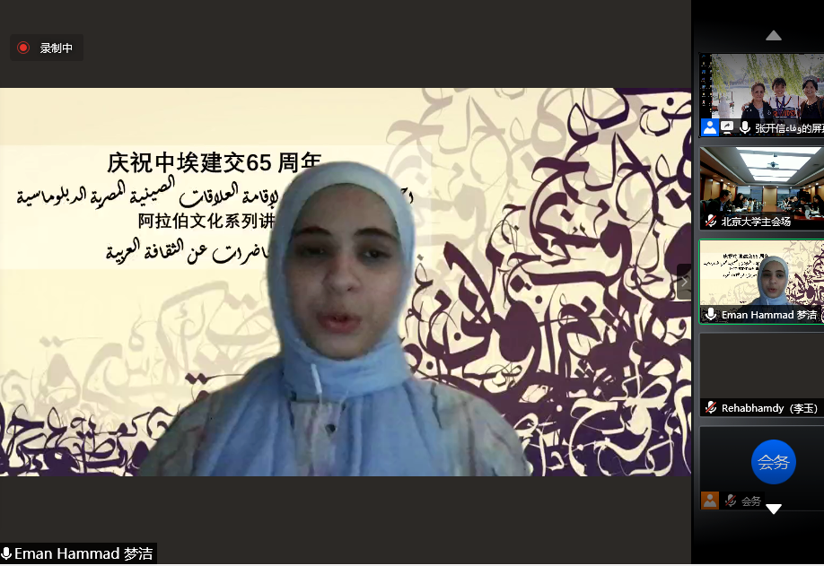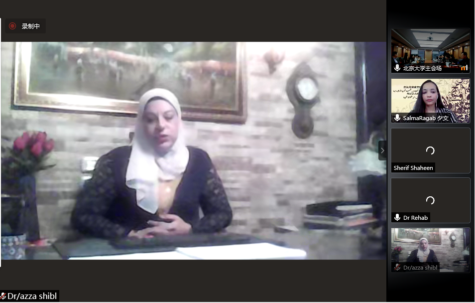 为庆祝中埃建交65周年,继成功举办北京大学与开罗大学“中国文化春令营”活动之后,两校又进行了新一轮的合作,于5月7日至8日联合举办“阿拉伯文化春令营”系列讲座。本次系列讲座线上线下协同进行。出席开幕式的有开罗大学文学院院长谢里夫•沙欣(Sherief Shahin)、文学院中文系主任兼孔子学院院长李哈布(Rehab),文学院阿拉伯语系教授阿扎•席波乐(Azza Shebl),中文系教师李玉(Rehab)、梦洁(Eman)、夕文(Salma),开云电子登录副院长付志明、阿拉伯语系主任林丰民、叙利亚籍专家哈穆德•优尼斯(Hamoud Younes)、叙利亚籍专家赛米拉•萨拉玛(Samira Salami)、阿拉伯语系长聘副教授廉超群、讲师袁琳、助理教授李海鹏、埃及籍博士后高山(Alaa Mamdouh Akef)及阿拉伯语系40余名学生。