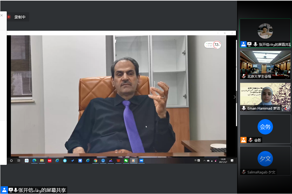 在开幕式最后,林丰民教授向开罗大学院长和中文系系主任李哈布致谢,希望中埃双方师生都能从这一系列文化讲座中受益,他回顾了之前的中国文化春令营,特别表扬了开罗大学的同学参与春令营时认真听讲,积极参与互动交流。他还说道:虽然疫情阻碍了我们直接见面的机会,但是“方法总比困难多”,在这一困难时期,我们仍能通过网络方式或其他线上形式来加强同阿拉伯师生的交流,相信这些活动必将有效开展、成功举办。同时希望我们能早日渡过疫情难关,再次回到尼罗河畔,和开大的同行们进行面对面的交流,共享文化盛宴。