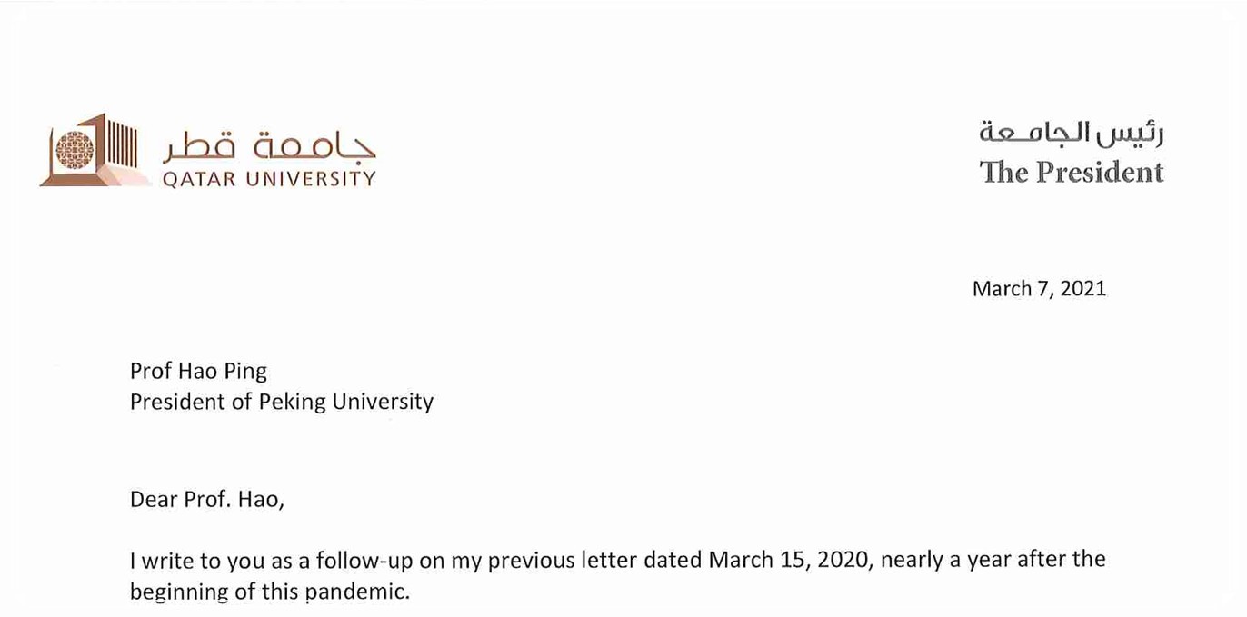 携手抗疫见真情,共克时艰促合作——北京大学与卡塔尔大学校长在两校开展抗疫合作一年之际互通信函
