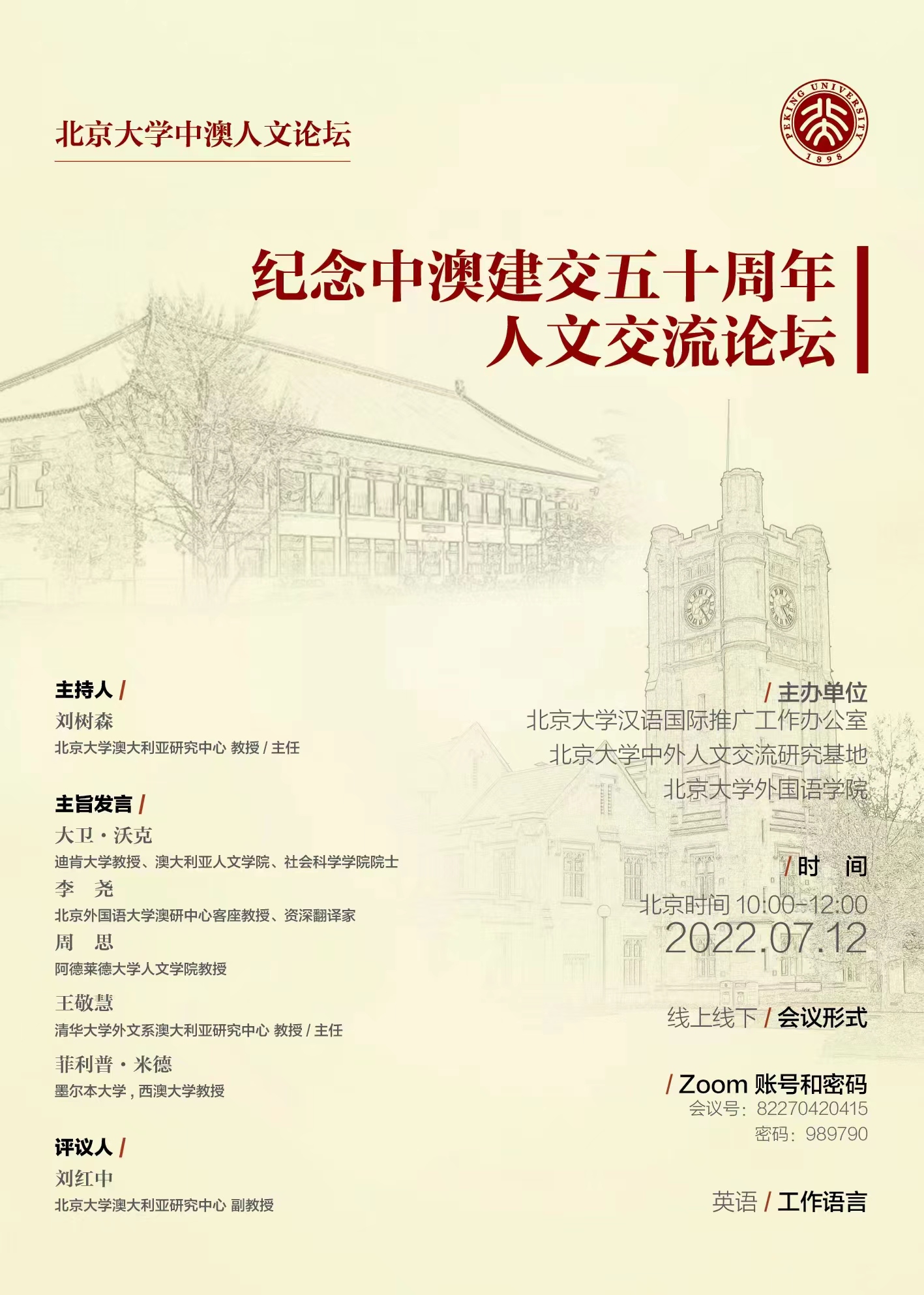 7月12日,由北京大学汉语国际推广工作办公室、北京大学中外人文交流研究基地、开云电子登录联合主办的“庆祝中澳建交五十周年人文交流论坛”通过线上线下相结合的方式成功召开。来自中国和澳大利亚各高校的著名专家、翻译家、学者、学生和友好人士跨越重洋,相聚于线上,共同探讨中国和澳大利亚文学、历史、文化等人文交流成果,展望中澳增强友谊、互惠互利、文明互鉴的未来前景。