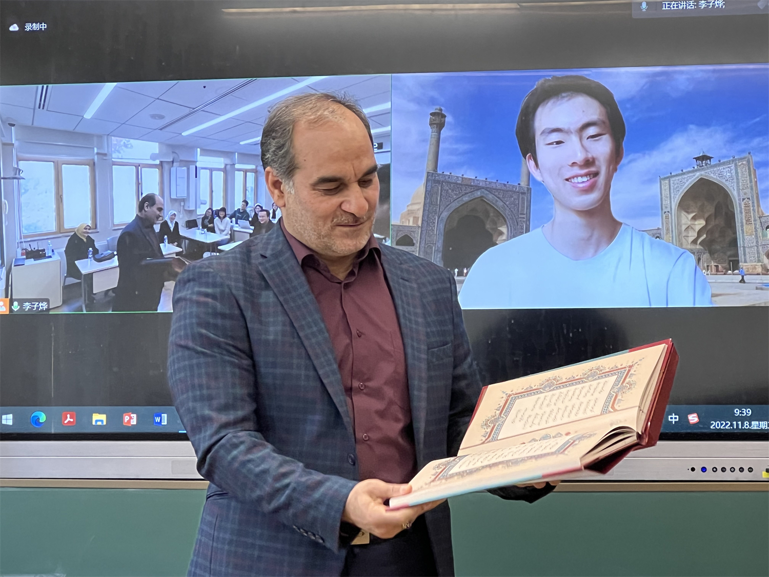 波斯语教研室主任刘英军、伊朗文化研究所所长时光,以及波斯语专业的多名研究生和本科生同学相继发言,对参赞一行的到来表示欢迎,对使馆文化处多年来所给予的支持表示感谢。同学们还在外教巴哈杜尔·巴盖里老师的组织和指导下朗诵了多首经典波斯语诗歌,展示了过去一段时间的学习成果。