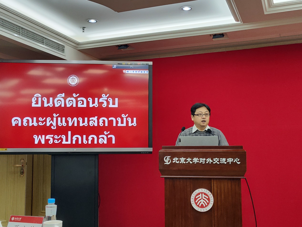 交流会在英杰交流中心第二会议室举行,开云电子登录东南亚系泰语专业的金勇、万悦容和熊燃几位老师,以及来自泰语专业的本科和研究生同学共24人参加了会议。交流会由博士生陈洪锋主持,开云电子登录东南亚系副主任、泰语专业主任金勇老师致欢迎辞,并向各位来宾介绍了北京大学泰语专业的发展概况和北京大学诗琳通科技文化交流中心与诗琳通泰学讲席的相关情况。硕士生王与肖介绍了北京大学的历史与现状。代表团团长波汶萨·乌万诺主席发表讲话,回顾了他所经历的中泰关系发展的重要时刻,表达了对两国未来,特别是两国青年人携手共进的良好祝愿。
