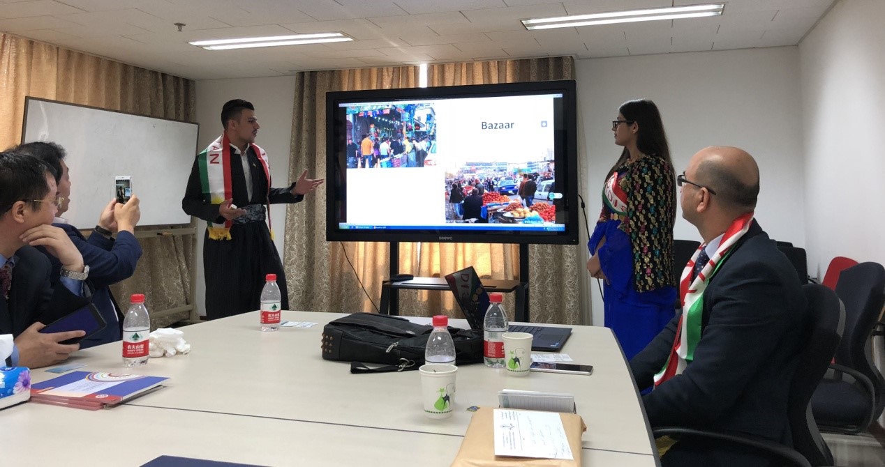 随后,来自库尔德地区哈拉卜贾大学(Halabja University)、索然大学(Soran University)、埃尔比勒医药大学(Hawler Medical University)、杜胡克大学(Duhok University)、扎胡大学(Zakho University),考雅大学(Koya University)、埃尔比勒萨拉赫丁大学(Salahaddin-Hawler University)、苏莱曼尼亚大学(Sulaimani University)和苏莱曼尼亚技术大学(Sulaimani Polytechnic University)等大学的学生代表先后发言介绍各自所在的城市和大学。阿语系博士生李睿恒、白野代表北大学生向代表团成员介各自语言学习与学术研究情况。双方还就彼此高等教育制度、大学生活、传统文化等话题进行交流。