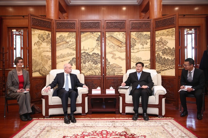 3月28日下午,应北京大学德国研究中心邀请,德国驻华大使葛策博士(Dr. Clemens von Goetze)访问北京大学并发表演讲。北京大学校务委员会主任、党委书记邱水平,北京大学副校长王博在临湖轩会见葛策一行。