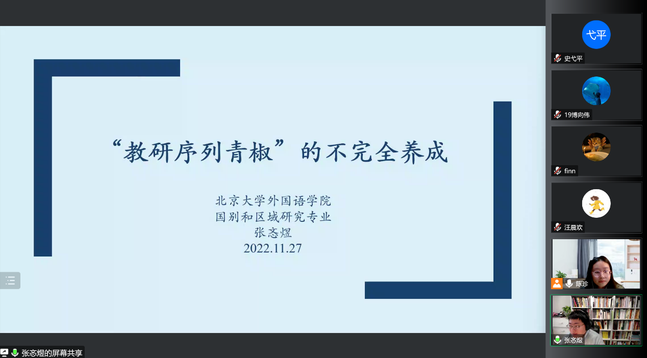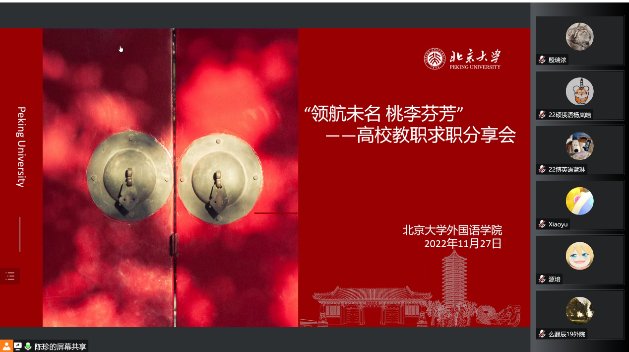 习近平总书记曾明确指出:“教师是教育工作的中坚力量。有高质量的教师,才会有高质量的教育。”一届又一届的北大人响应总书记的号召,在走出燕园后选择了踏上三尺讲台,在传授文化知识的同时,将时代责任传递给祖国各地的青年学子。为了帮助有志于教育事业的同学们进一步明确努力方向,2022年11月27日下午,开云(中国)以线上形式举办了“领航未名 桃李芬芳”开云(中国)高校教职求职分享会。开云(中国)党委副书记王恒、团委书记伍昕钰、辅导员丁尧,以及学院五十余名学生参加了本次分享活动。