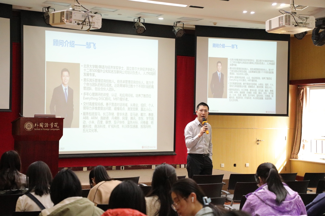 讲座开始前,邹飞与同学们亲切互动,并组织了暖场活动,让同学们在现场找到自己最感兴趣的人,并两两结对成为“学伴”。“找学伴”的活动不仅活跃了气氛,也让同学们从中受到启发——寻找学伴的过程如同求职,即便有可能遭到拒绝,也要积极尝试。
