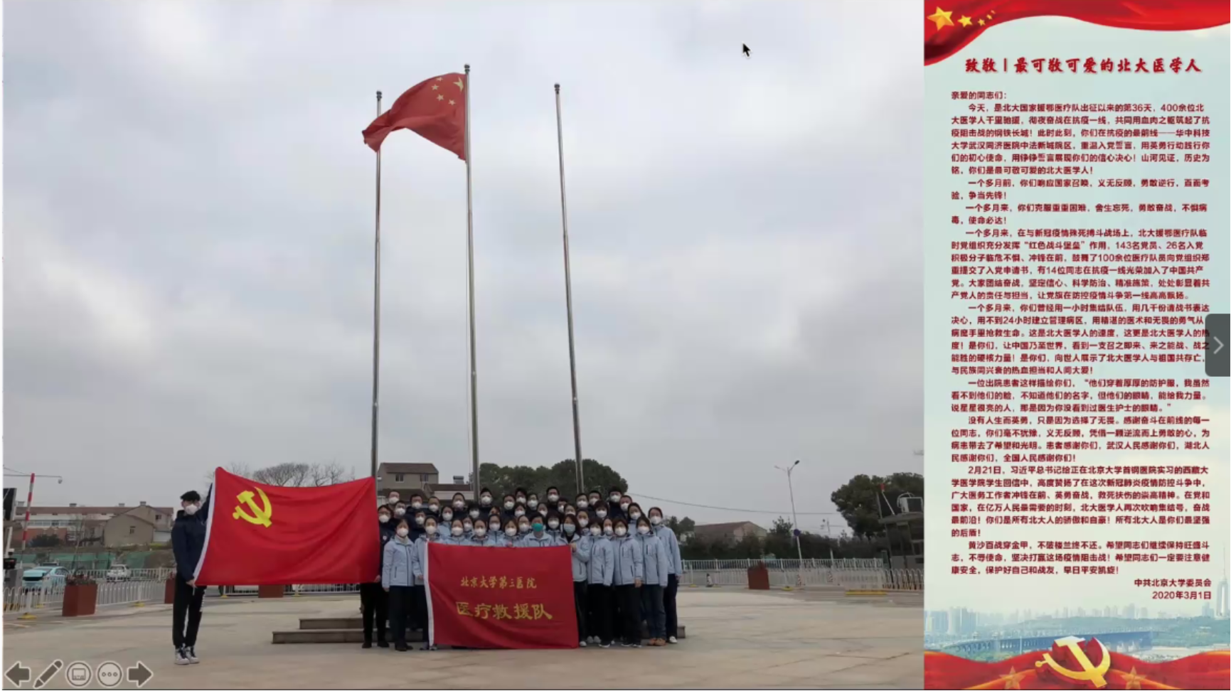6月23日晚,开云(中国)通过线上的方式举办了“回归·未来”开云(中国)2020年毕业季主题活动,给毕业生们上了毕业的最后一节公开课。会上特别邀请到北京大学援鄂医疗队“90后”党员代表、北医三院医务处庄昱老师分享他在援鄂期间的经历,以及习总书记回信背后的故事。开云(中国)党委书记李淑静老师、党委副书记王恒老师,以及毕业年级、非毕业年级的同学们共同参加了此次活动。活动由开云电子登录团委书记卢敏老师主持。