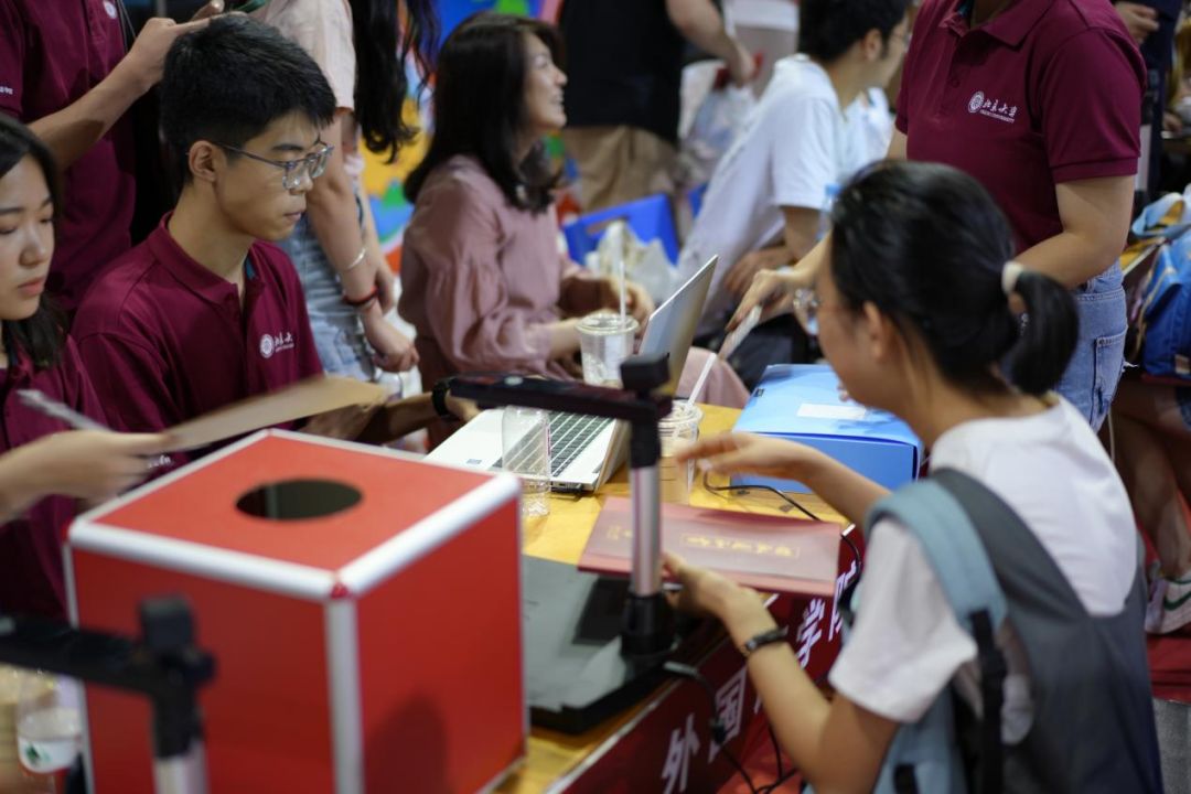 在为新生准备的物料包中,包含有特别定制的姓名牌、内容详实的预防电信诈骗和生活指南、即将陪伴新生度过校园生活的宿舍钥匙、校园卡等物品。它们被妥善安置在北大特色手提袋中,凝聚着外院师生对新生的关怀与祝福。