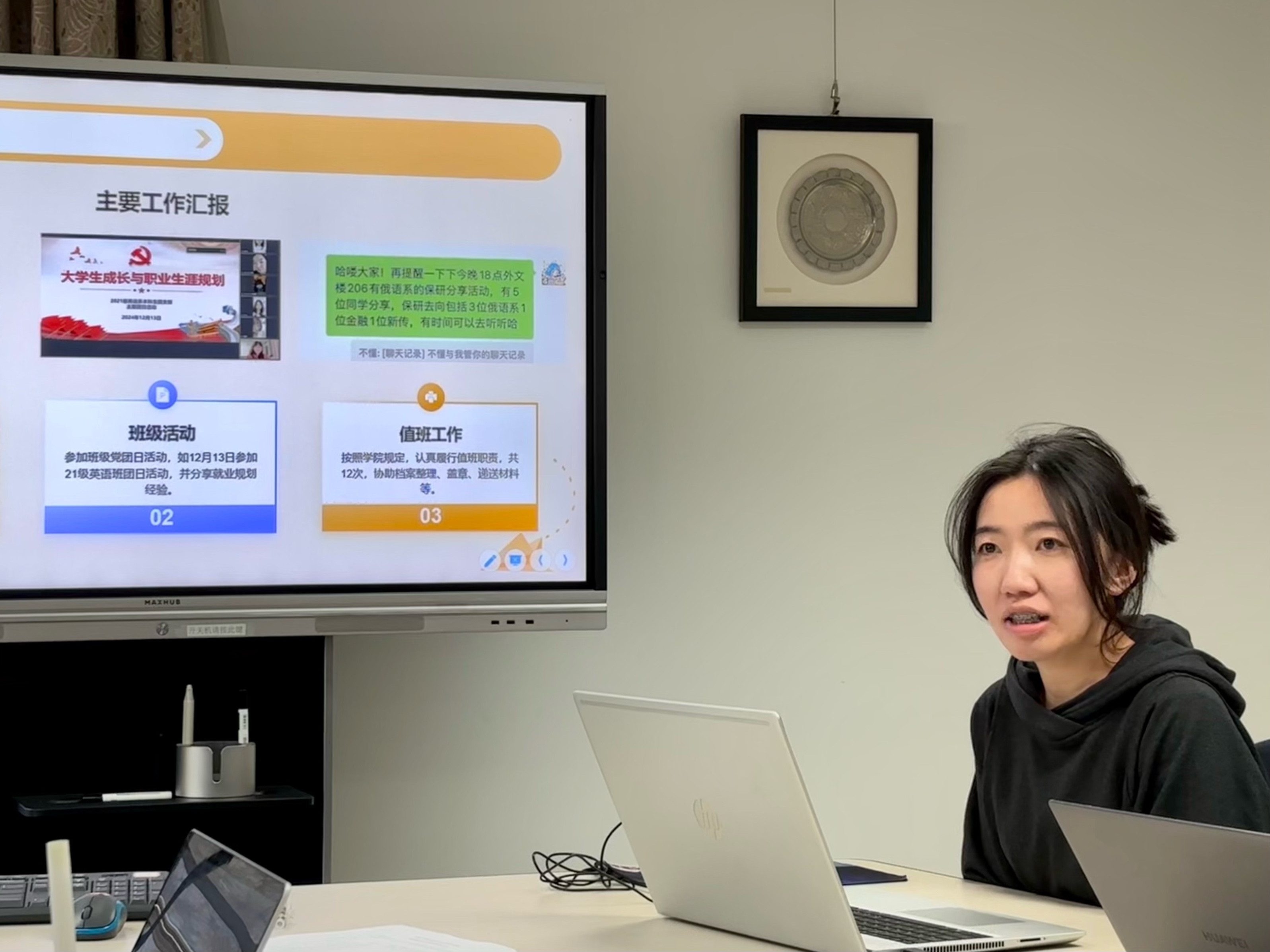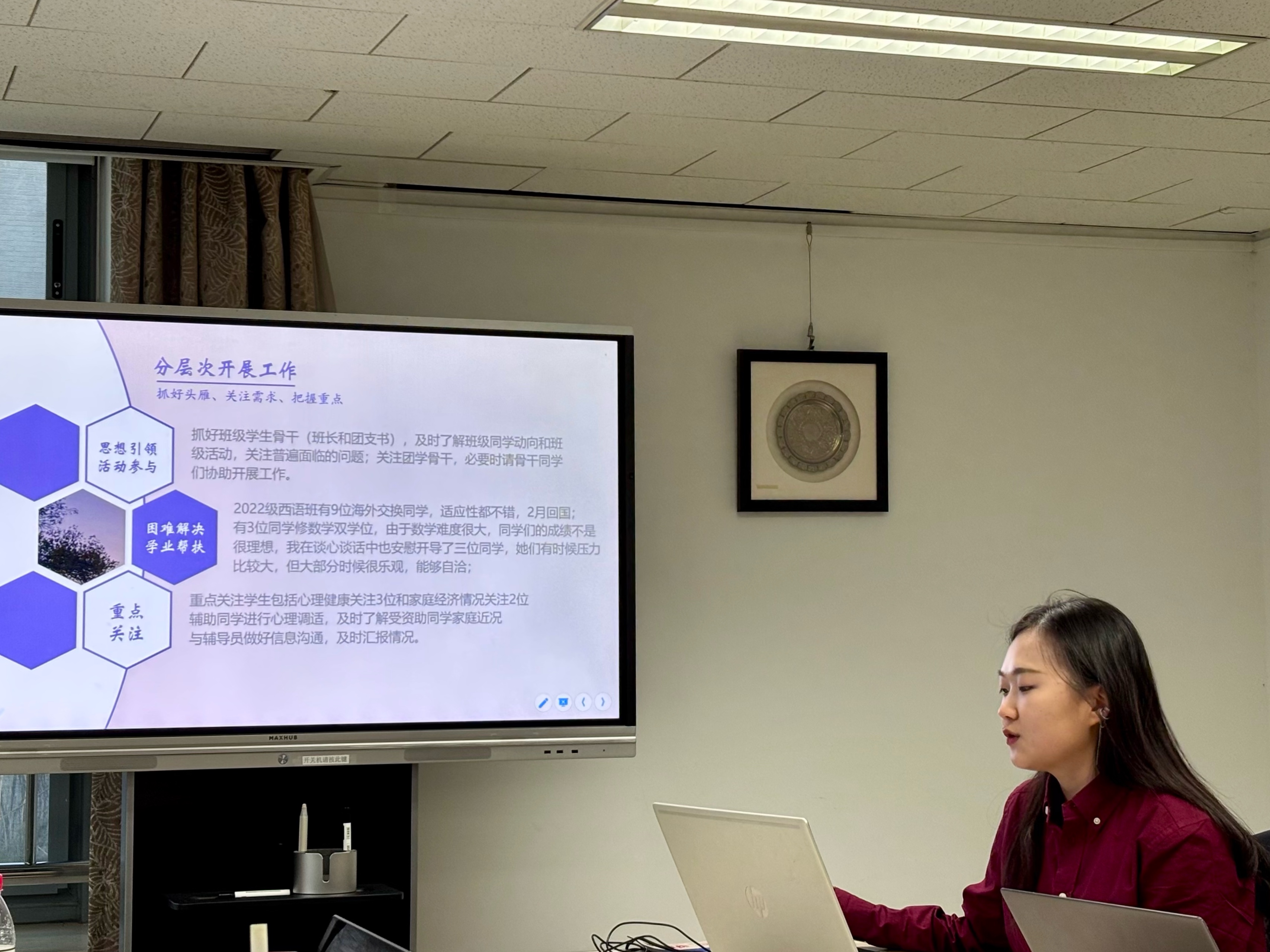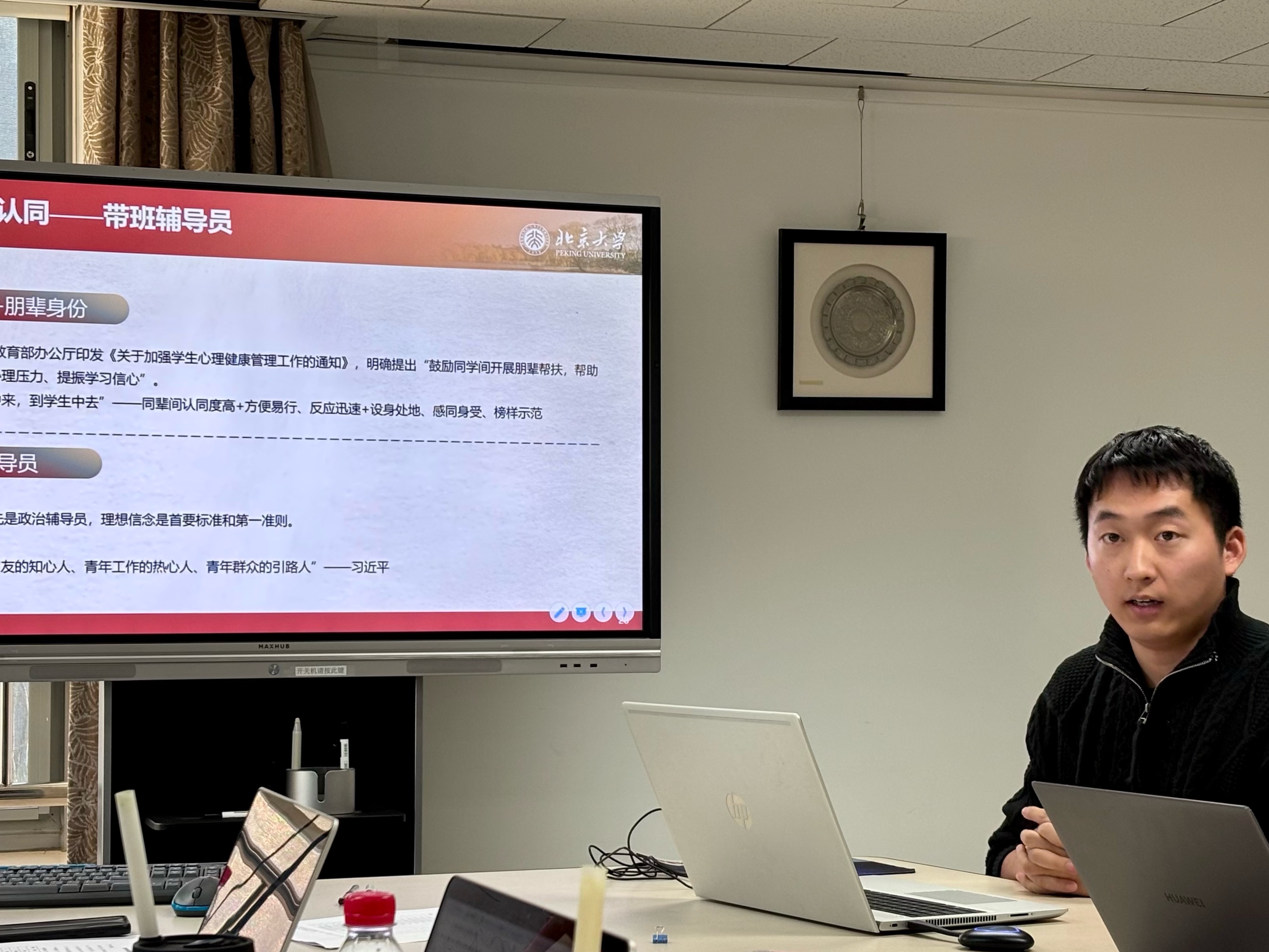 首先,带班辅导员依次进行述职。他们分别介绍了所带班级的基本情况,总结了本学期开展谈心谈话、参加班团活动、参与心理技能培训等工作内容,展示了个人的特色创新工作。同时,带班辅导员们也对寒假和春季学期的工作做出了规划与展望,包括优化工作思维,凸显思政引领价值;立足同学所需,持续做好深度辅导;注重示范引领,创新集体活动形式;加强朋辈交流,推动带班辅导员之间的互动学习等。