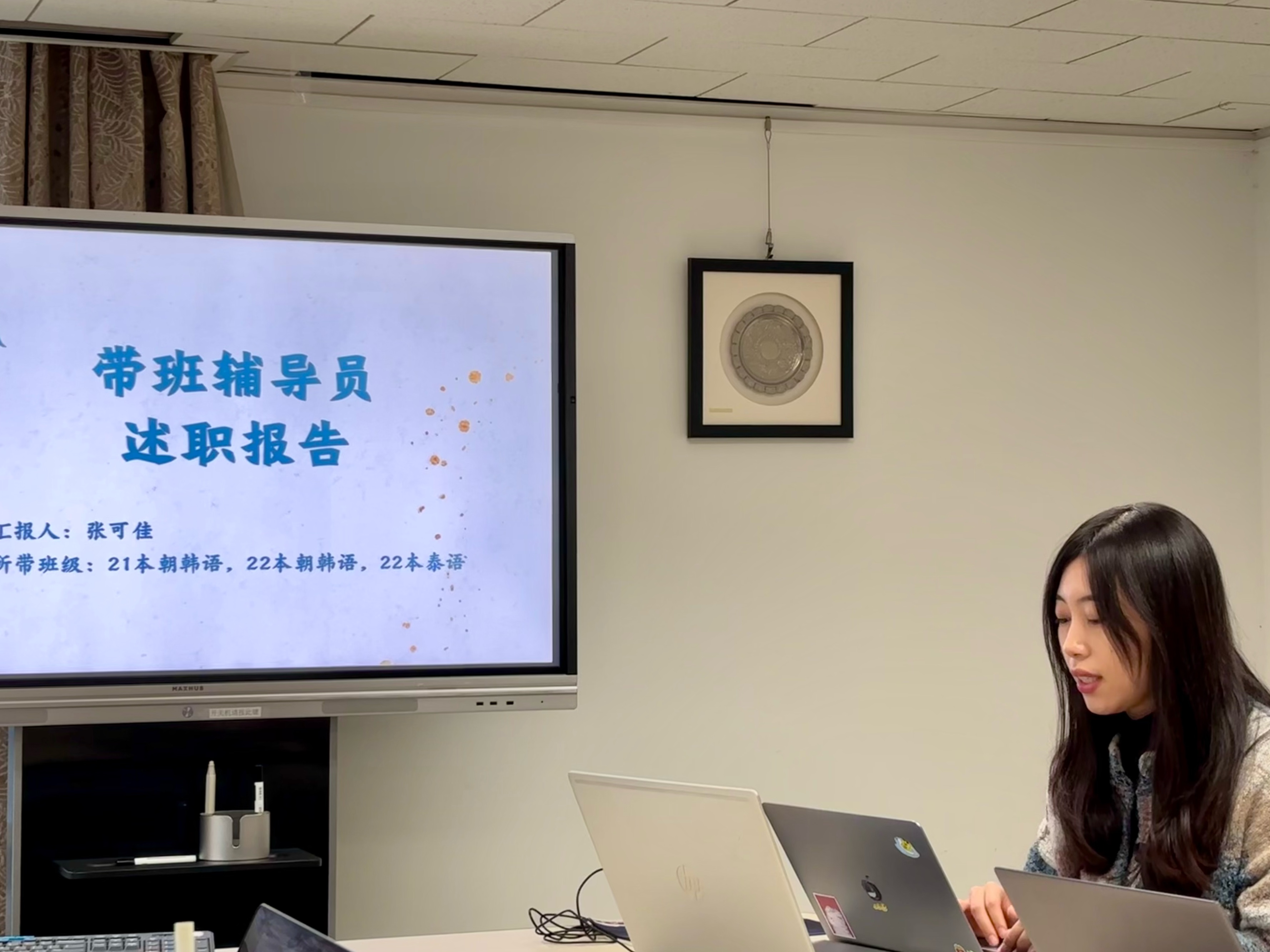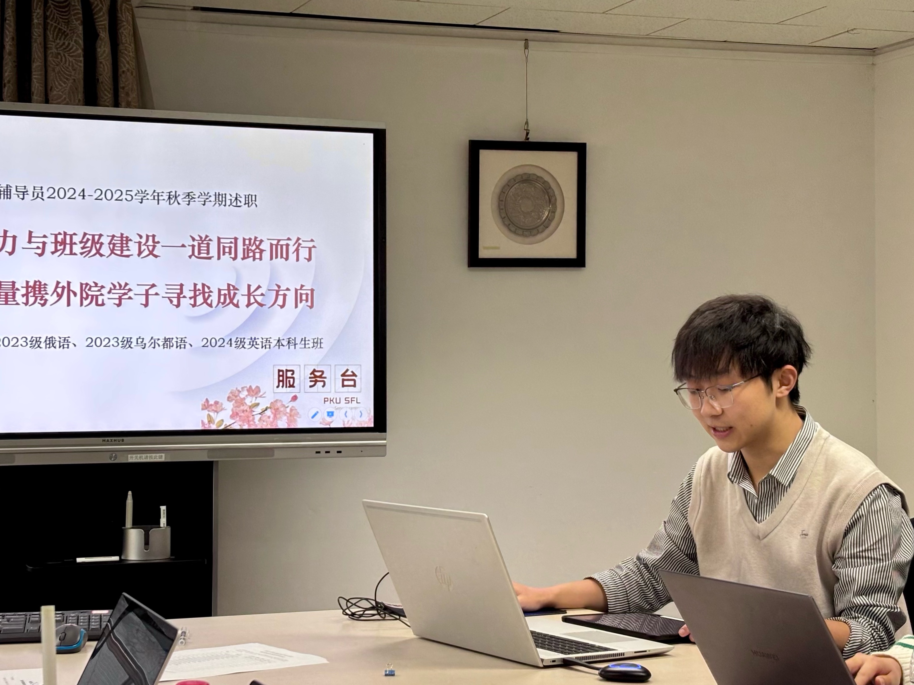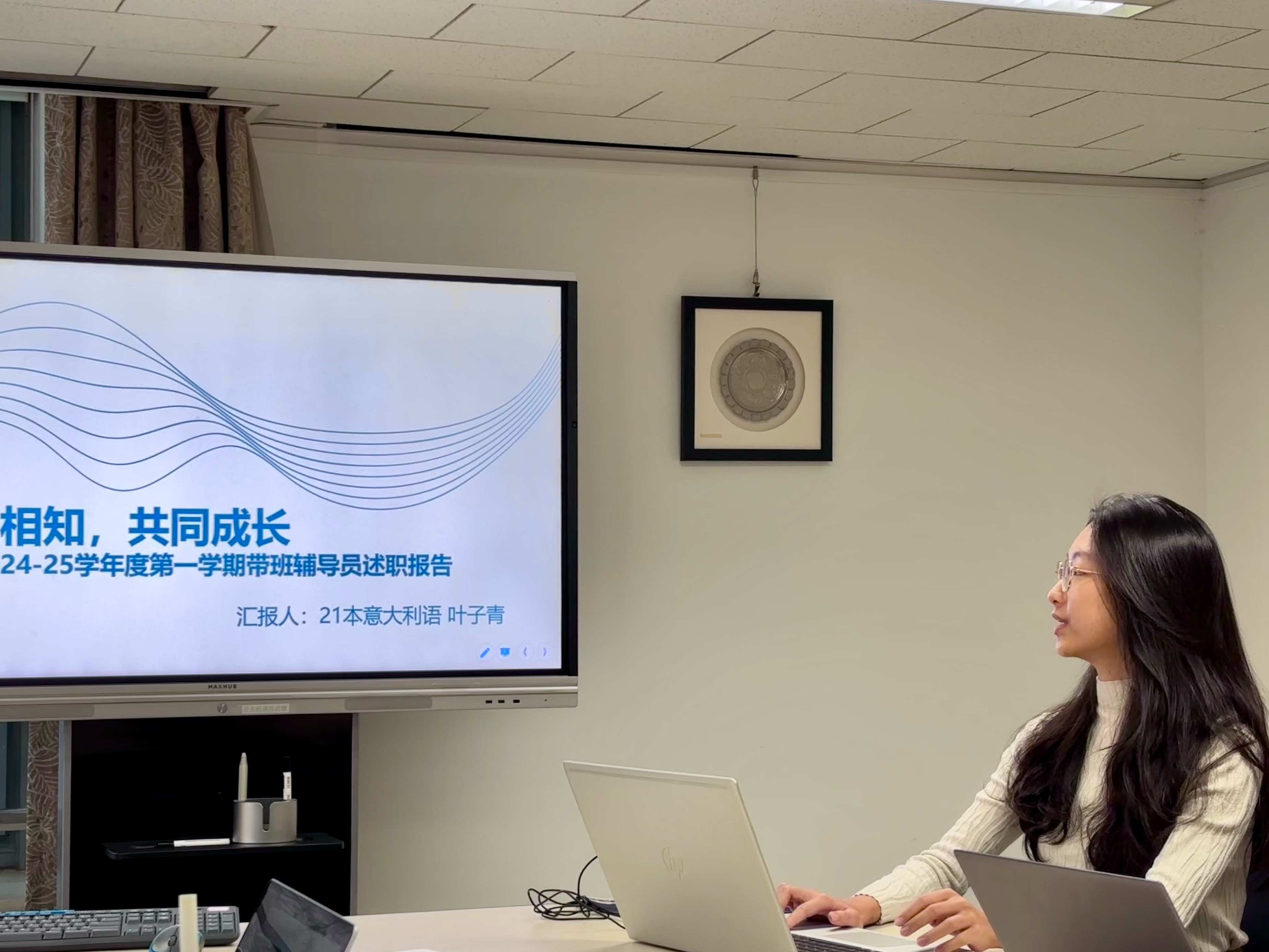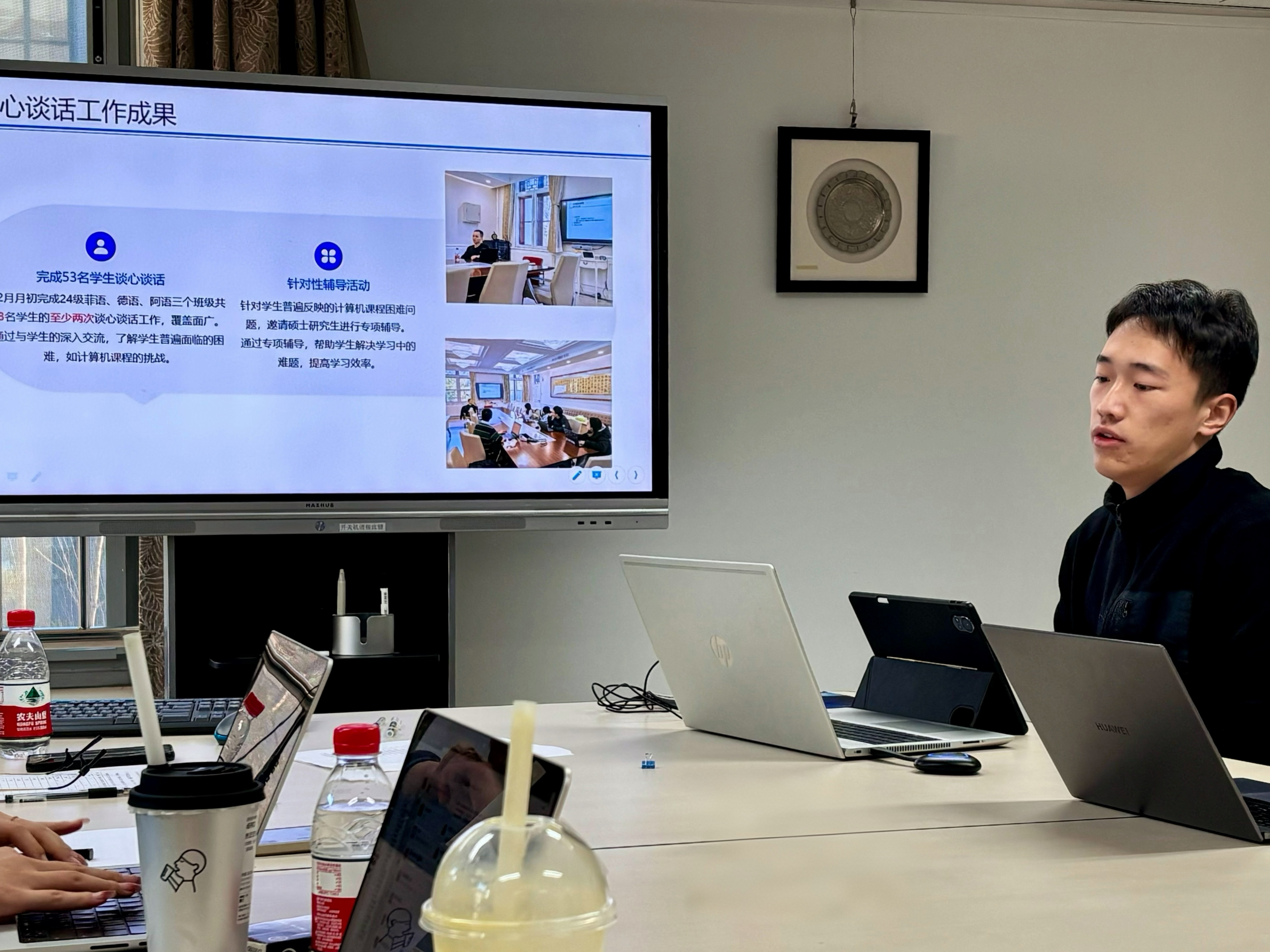 首先,带班辅导员依次进行述职。他们分别介绍了所带班级的基本情况,总结了本学期开展谈心谈话、参加班团活动、参与心理技能培训等工作内容,展示了个人的特色创新工作。同时,带班辅导员们也对寒假和春季学期的工作做出了规划与展望,包括优化工作思维,凸显思政引领价值;立足同学所需,持续做好深度辅导;注重示范引领,创新集体活动形式;加强朋辈交流,推动带班辅导员之间的互动学习等。