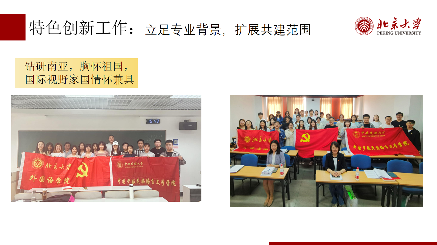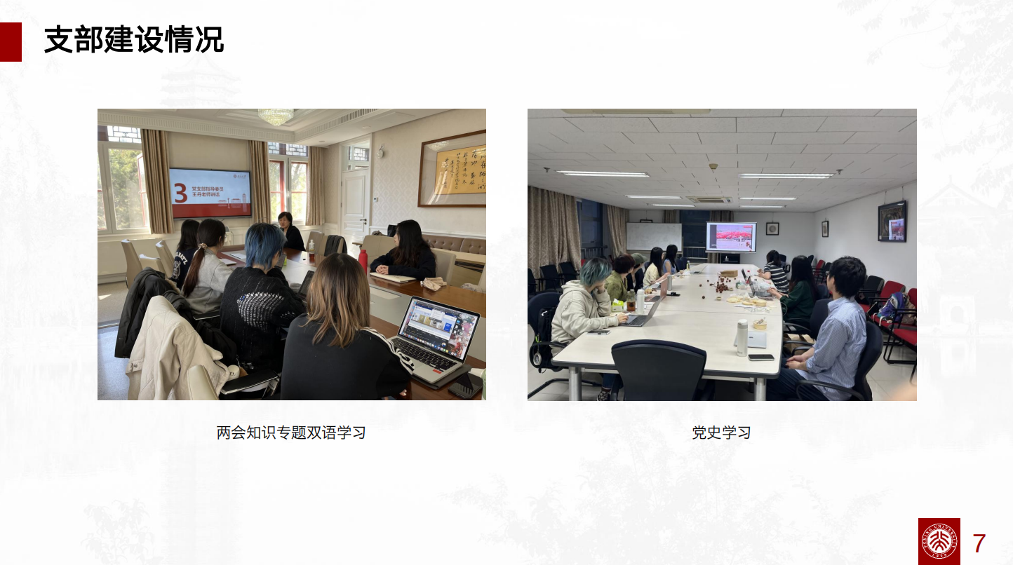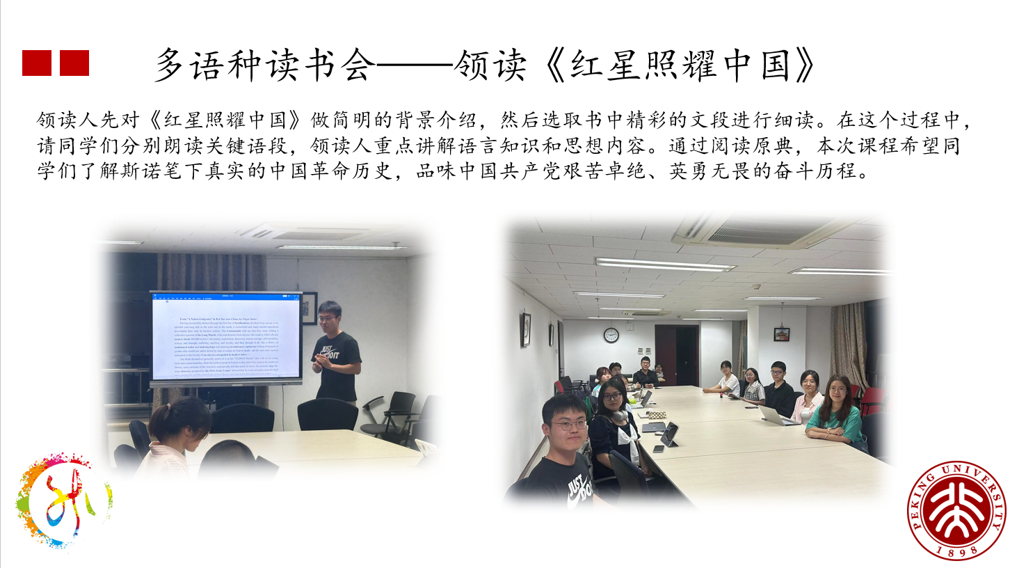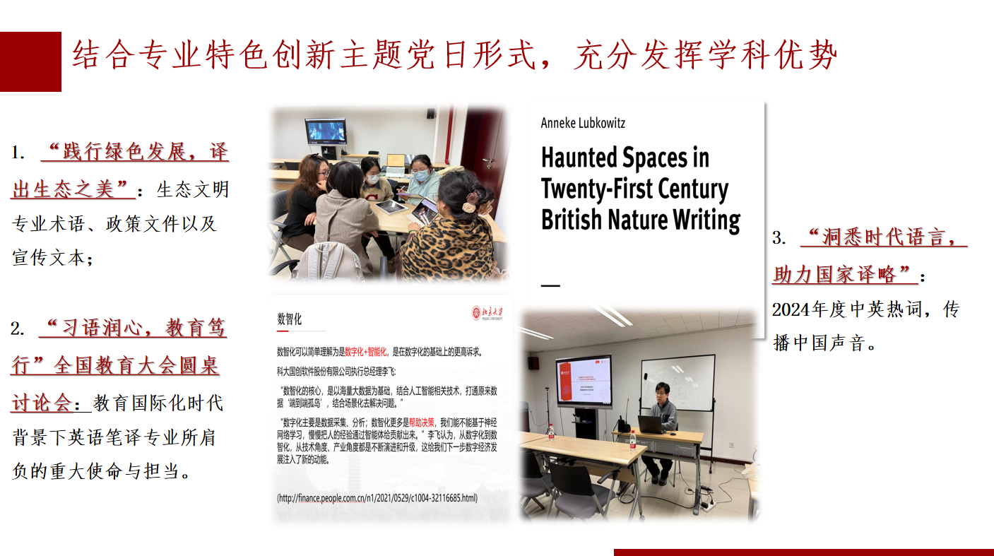 理论学习是提高党性修养的终生之需,是提高工作水平的重要途径,也是提高党员政治站位的重要方式。亚非研究生党支部邀请北京大学团委博士生讲师团举办理论宣讲学习活动,深入开展学习贯彻习近平新时代中国特色社会主义思想主题教育。本科生第七党支部打破传统理论学习的单向输出模式,围绕不同主题,持续深化红色“1+1”共建成果。德法西葡研究生党支部开设“每周一学”理论学习栏目,及时分享党的最新理论成果,引导党员同志关注国家大事,不断提升党性修养。朝韩语研究生党支部、英语翻译硕士生党支部和英语研究生党支部致力于建设有外语特色的学习型党支部,从理论学习到翻译实践,在增进专业技能的同时激发支部党员讲好中国故事的责任感与使命感。