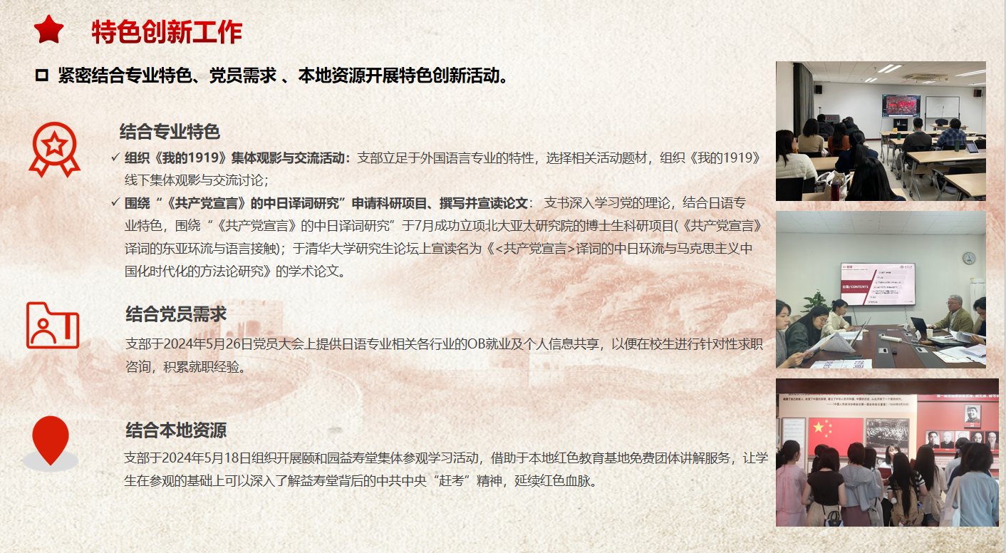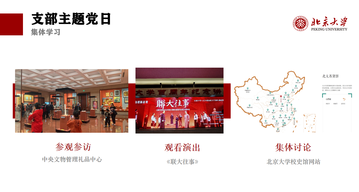 各支部积极动员党员深入社会基层课堂,躬身践行青年使命,助力青年党员感受时代脉搏,体悟社会发展。本科生第二党支部开展“重温领袖足迹,感悟伟大成就”暑期调研活动,引导支部党员与黄土相拥、与国情相逢、与人民同心、与时代同行,把论文写在祖国大地上。本科生第五党支部先后前往北京奥运博物馆与中国海关博物馆开展参访学习,将专题党课搬进爱国主义教育基地,用好红色资源,赓续红色血脉。世文所语言所研究生党支部策划主题党团日活动,集体前往蔡元培故居,感受蔡元培先生矢志不渝的精神风貌。日语研究生党支部组织开展颐和园益寿堂参访学习活动,引导党员同志深入了解“赶考”精神,坚定理想信念,汲取奋进力量。