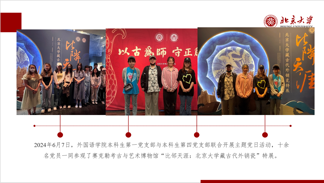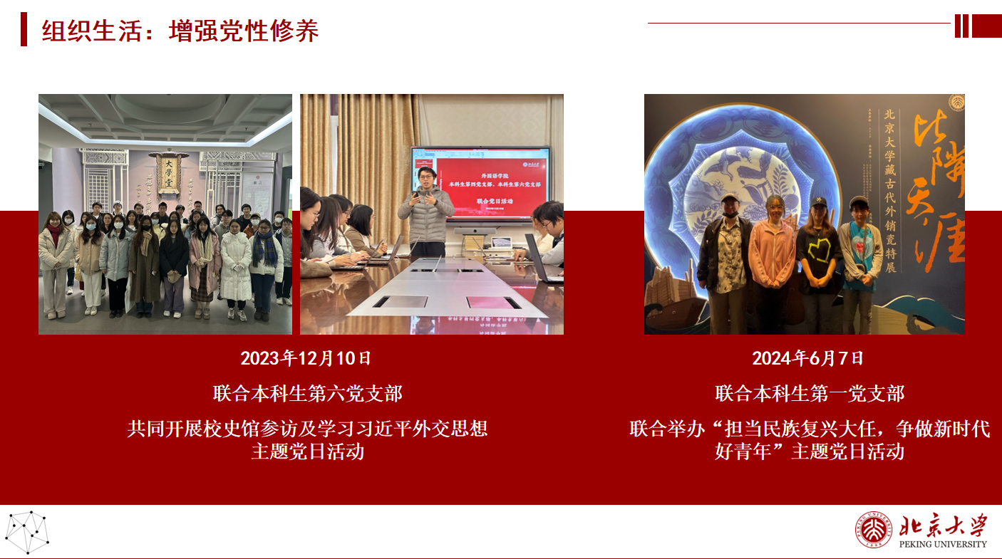 各支部丰富活动主题,创新活动形式,积极开展联合共建活动,为党员提供沟通交流的机会,同时借鉴其他支部建设经验。本科生第一党支部与本科生第四党支部联合举办主题党日活动,组织党员参观赛克勒考古与艺术博物馆,深刻体悟中华文化与中华文明的对外交流史。俄语研究生党支部与本科生第五党支部共同前往中央礼品文物管理中心,深入了解国礼的历史传承和丰厚底蕴。南亚研究生党支部、本科生第六党支部与清华大学、中国人民大学、中央党校(国家行政学院)学生党支部开展四校基层学生党支部联学活动,通过党团共建等形式扩大支部活动辐射面和影响力。