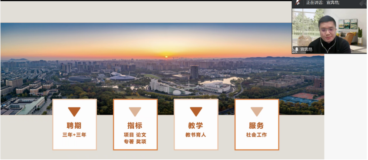 首先进行分享的是宣奔昂。他以自身从博士毕业到入职浙江大学的完整经历为例,系统梳理了高校求职的核心环节:从2021-2022年集中发表高水平论文积累学术资本,到2023年通过学术论坛与意向单位建立定向联系,再到经历专业面试、教学试讲、学术委员会评审三重考核。