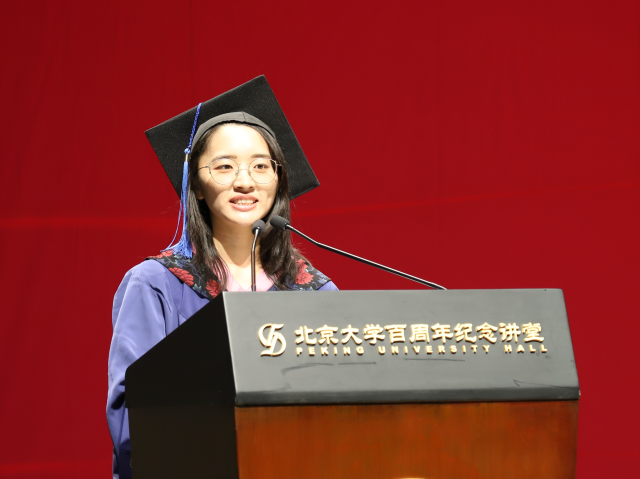 2015级德语系本科生高泽宇代表本科毕业生发言。高泽宇首先回忆了燕园生活的点滴,讲述了自己求学过程中经历的困难与挫折,并借此总结了自己的心路历程,即在老师与同学的指引和帮助中完成对自我的全新认知。他同时提出,作为外院学子,要“掌握外国语言,讲好中国故事”,真正将个人命运与国家命运相结合。最后,高泽宇代表全体本科毕业生表达了对学院和老师们的感激之情,表示将不忘初心,在今后的岗位上为人民谋幸福、为民族谋复兴。