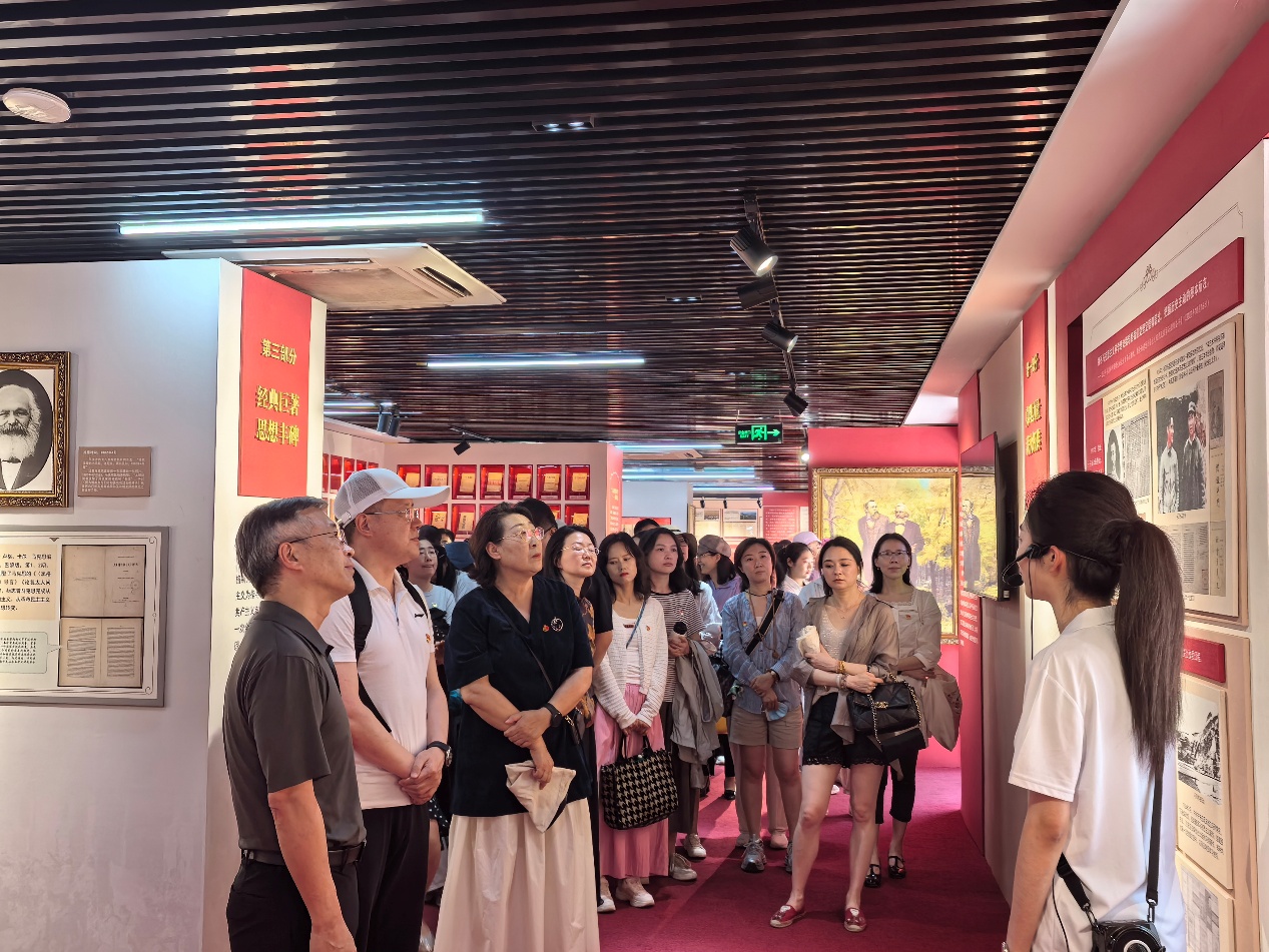 随后,参访团跟随讲解员的脚步,参观了图书管理室、校长办公室、文科学长室、第二阅览室、第三十六教室等老北大校舍场景。老师们在一件件泛黄的报刊前驻足凝视,在一张张复原的桌椅旁轻轻摩挲,仿佛穿越时空,置身于风云激荡的年代,沉浸式感受中国共产党的百余年光辉征程。