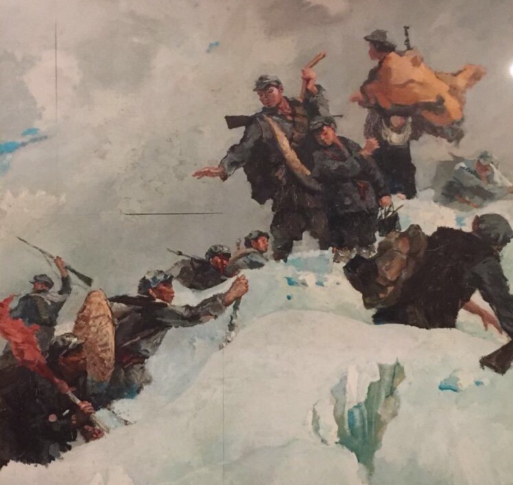 在最后一个展区----第六部分“长征画卷”里,大家在两幅巨幅油画前久久停留。一幅名为“万里征程诗不尽”,那是身着红军军装的毛主席骑马驰骋在长征路上的油画。另一幅名为“长征路上的宣传员”,只见一名手打竹板的红军宣传员在长征路上给奋力攀爬雪山的战友们鼓劲加油。在艺术家的笔下,无论是伟人还是普通的红军战士,长征精神-----勇于战斗、无坚不摧的革命英雄主义,在这里被展现得淋漓尽致。