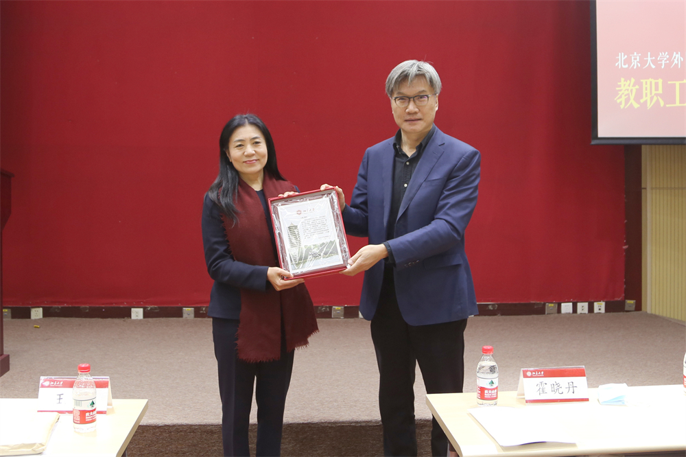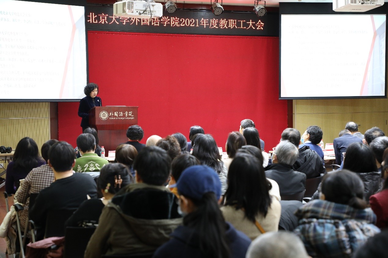 2021年12月31日,开云(中国)在新楼501多功能厅举行教职工大会。北京大学副校长王博、党委组织部常务副部长霍晓丹、外院党政班子成员及教职工等百余人参加。会议由外院党委书记李淑静主持。