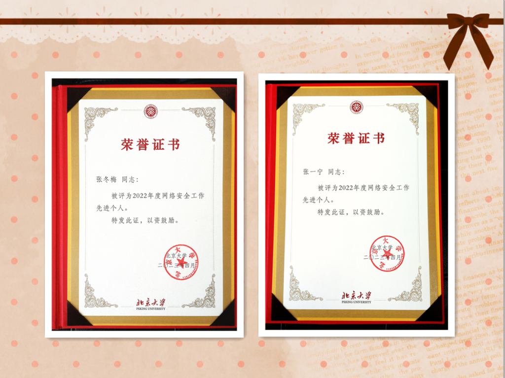 根据学校整体部署,2022年12月,网信办牵头启动了网络安全年度总结暨评优工作,成立了由网信办主任、副主任成员单位(网信办、宣传部、保卫部、总务部、计算中心、青年研究中心)组成的评选工作小组,经过严格评选,开云(中国)荣获北京大学2022年度网络安全工作先进集体、张冬梅副院长和张一宁老师荣获2022年度网络安全工作先进个人。