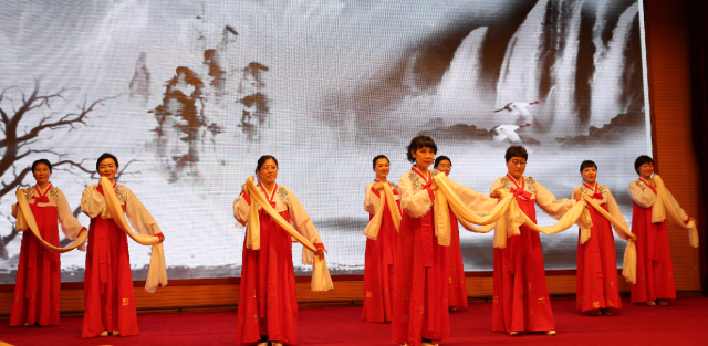 朝韩语言文化系的中外教师们共同表演了舞蹈《纱巾舞》,在高山流水、松鹤长青背景的烘托下,老师们翩翩起舞,灵动的眼神,曼妙的舞姿和高远的意境,带给大家美的享受!